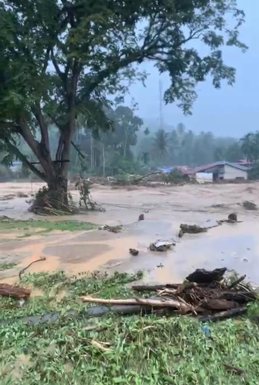 Air sungai yang mengalir deras turut membawa batang pokok dan sampah sarap sehingga memenuhi jalan dan kediaman penduduk.
