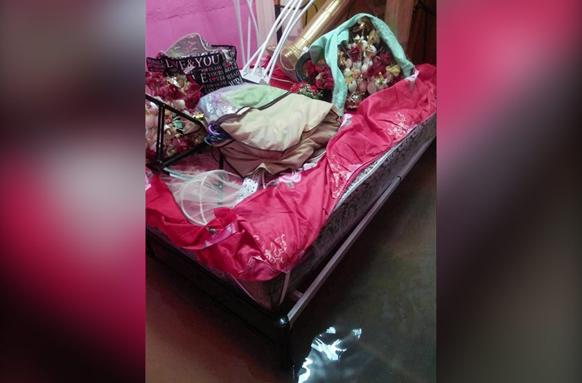 Bencana alam itu turut menyebabkan anak bongsu daripada tiga beradik itu terpaksa berputih mata apabila beberapa kelengkapan penting seperti pelamin dan set bilik tidur yang telah dihias ditenggelami air separas hampir satu meter.