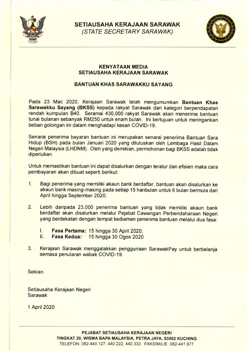 Bantuan khas Sarawakku Sayang kepada golongan B40 di Sarawak akan disalurkan ke akaun masing-masing pada setiap 15 hari bulan bermula April hingga September 2020.