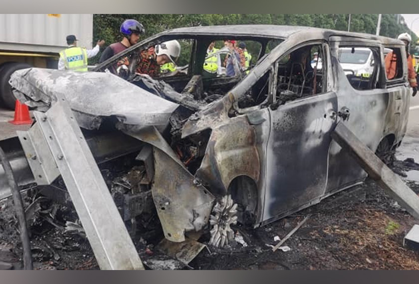 Sejurus tiba di lokasi, pihaknya mendapati kenderaan jenis Toyota Alphard sedang terbakar selepas melanggar penghadang jalanraya.