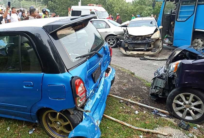 Akibat kegagalan brek berfungsi, sebuah bas kilang merempuh 14 kenderaan yang sedang berhenti di persimpangan lampu isyarat Amanjaya Sungai Petani, pagi ini.