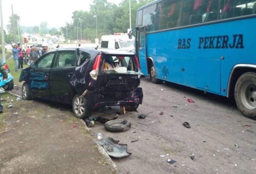 Akibat rempuhan itu, terdapat beberapa pekerja di dalam bas kilang terbabit yang terpelanting keluar dan jatuh di bahu jalan.