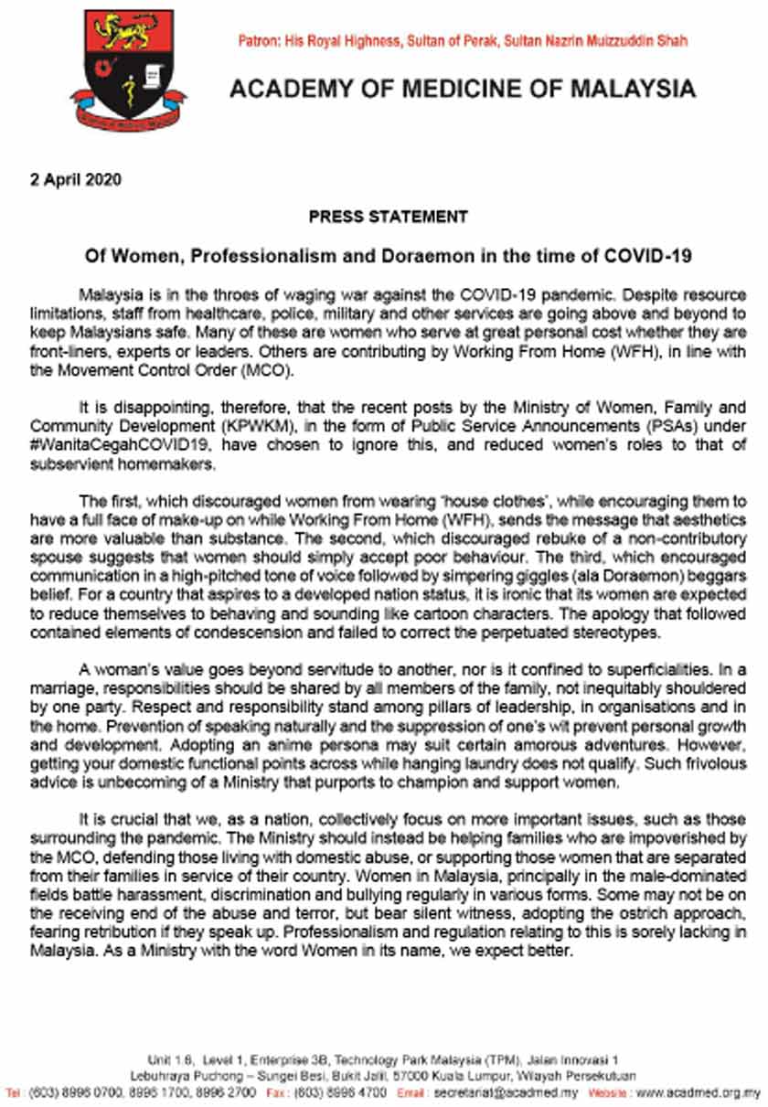 Akademi Perubatan Malaysia (AMM) membidas saranan Kementerian Pembangunan Wanita, Keluarga dan Masyarakat (KPWKM) yang menggesa golongan wanita supaya bersolek seperti hari biasa ke pejabat ketika tempoh Perintah Kawalan Pergerakan (PKP) sebagai 'memperlekehkan' kedudukan golongan itu.