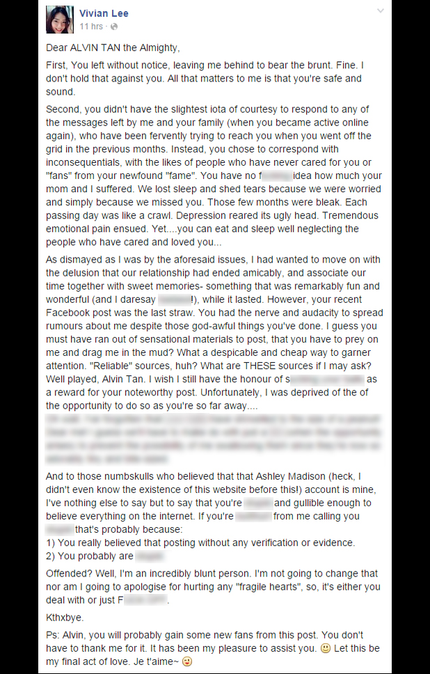 Status terbaharu Vivian Lee yang dilihat melahirkan kekecewaan terhadap Alvin Tan - Gambar Facebook