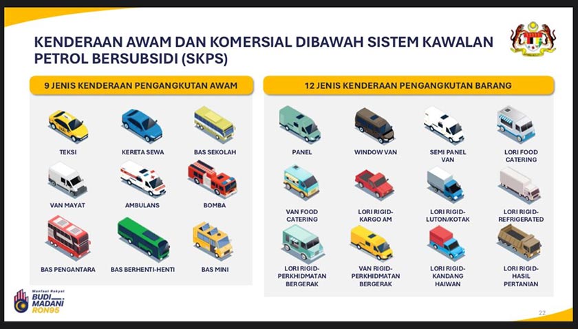 - Kerajaan menegaskan tiada sebab berlaku kenaikan harga barangan susulan pelaksanaan SKPS kerana jumlah kenderaan sektor logistik yang terlibat adalah kecil dan subsidi disalurkan secara tersasar melalui Fleet Card.