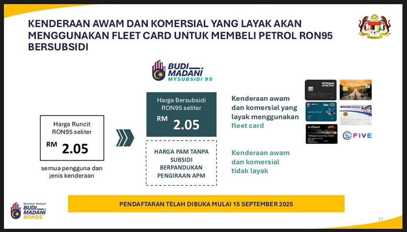 "Bagi sektor logistik, kita sudah mengenal pasti jenis kenderaan yang layak untuk menerima Fleet Card. Dengan kemudahan ini, mereka boleh membeli petrol pada harga semasa RM2.05 seliter," katanya pada taklimat media berhubung Budi MADANI RON95, di sini pada Selasa.