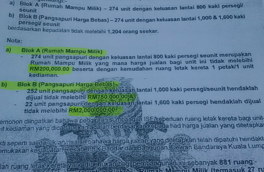 Surat asal yang diluluskan DBKL menunjukkan harga pangsapuri harga bebas di Kampung Datuk Keramat mencecah harga sehingga RM2 juta - Sumber gambar Datuk Johari Abdul Ghani