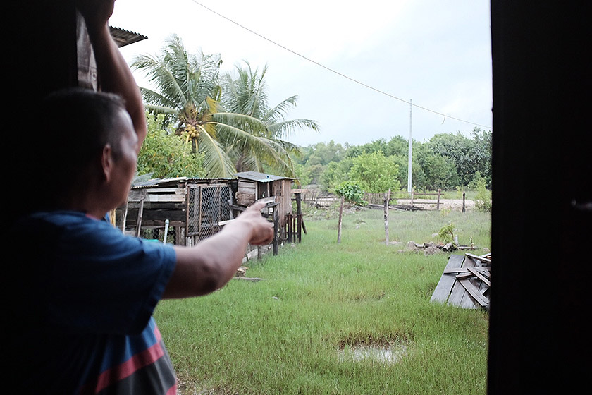 Juhan Johari menunjukkan arah Sungai Merchang dari rumahnya yang membawa air besar sehingga menyebabkan banjir di kampungnya - Gambar Astro AWANI/ Israr Khalid