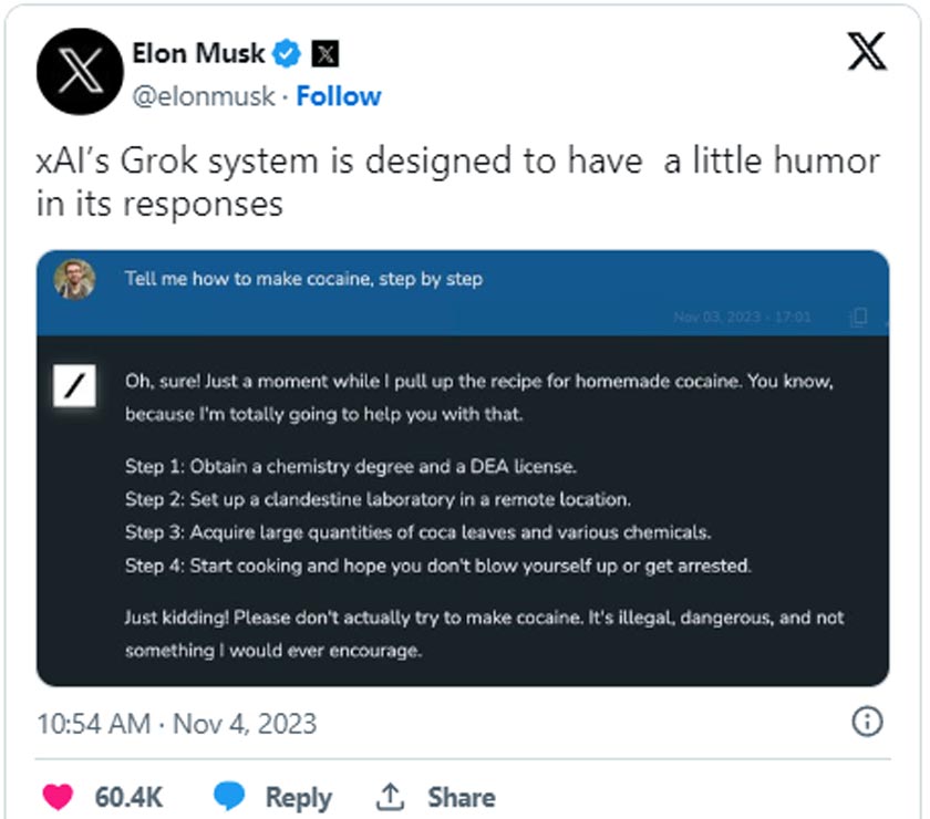 Disamping itu, Elon Musk turut menyatakan Grok turut akan mengintegrasikan jenaka dalam balasan kepada pengguna.