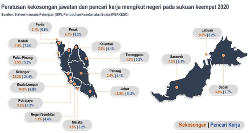 Berdasarkan analisis yang dilakukan oleh Pusat Kajian Pasaran Buruh Masa Hadapan EIS-UPMCS (EU-ERA) melalui laporan ‘Quarterly Labour Market Perspectives – Modest Labour Market Recovery’, jumlah kekosongan jawatan yang diminta oleh industri lebih berpusat di negeri membangun dengan taburan perindustrian (termasuk perkhidmatan) tinggi seperti Selangor, Kuala Lumpur, Johor dan Pulau Pinang. Secara keseluruhannya, negeri-negeri ini merekod sekitar 69.3 peratus daripada kekosongan jawatan pada sukuan keempat 2020.