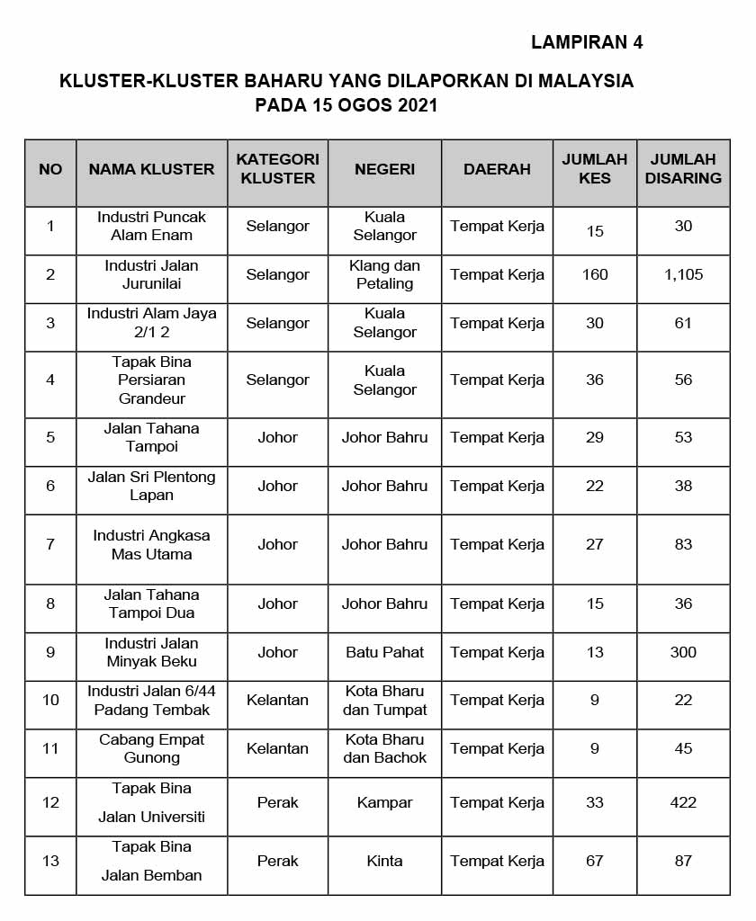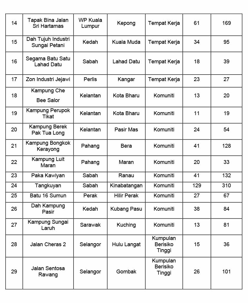 Ia menyaksikan tempat kerja sebagai penyumbang tertinggi, iaitu 17 kluster, diikuti kluster komuniti sebanyak 10 kluster dan dua kluster kumpulan berisiko.