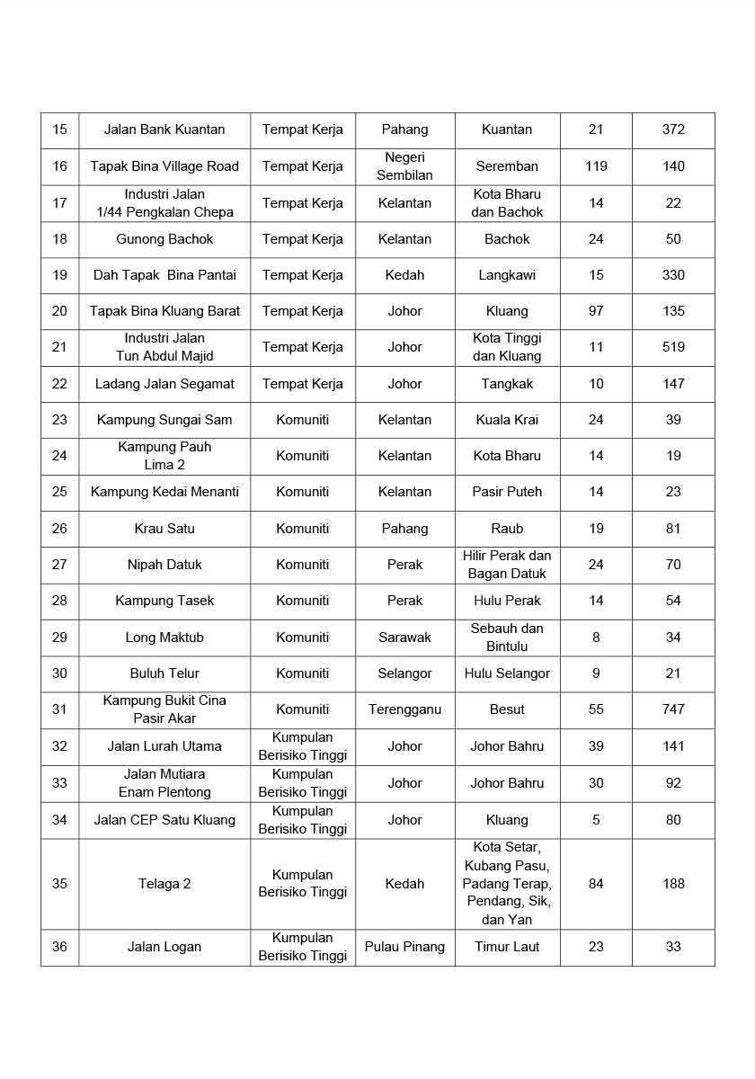Perincian 41 kluster baharu yang dikenal pasti adalah seperti di bawah: