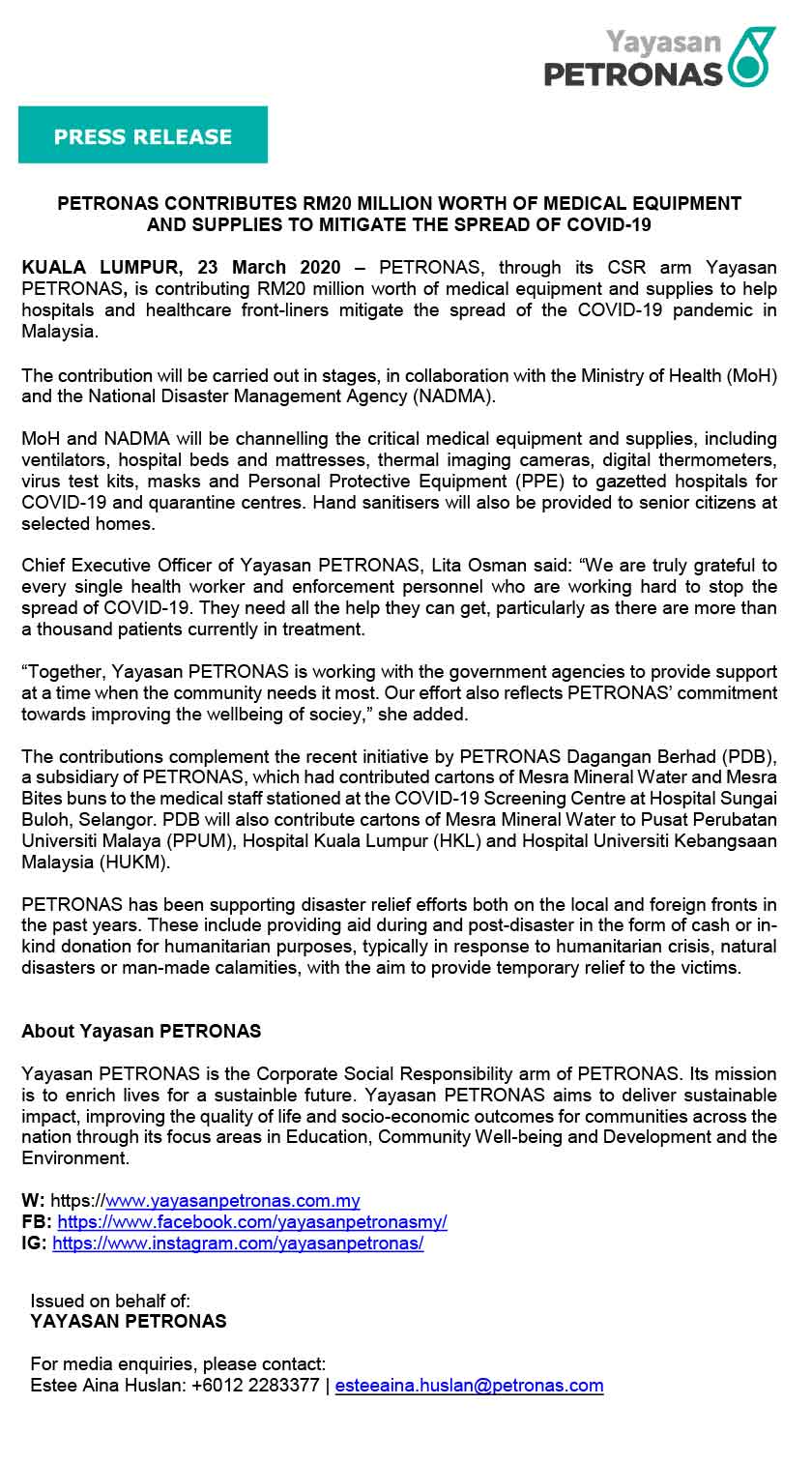 “Bersama-sama, Yayasan Petronas bekerjasama dengan agensi kerajaan untuk memberikan sokongan kepada masyarakat pada saat genting ini.
