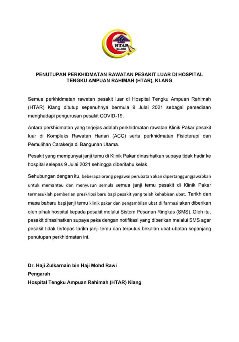 Menurut Pengarah HTAR, Dr Zulkarnain Mohd Rawi pesakit yang mempunyai janji temu di klinik pakar dinasihatkan tidak hadir ke hospital sehingga diberitahu kelak.