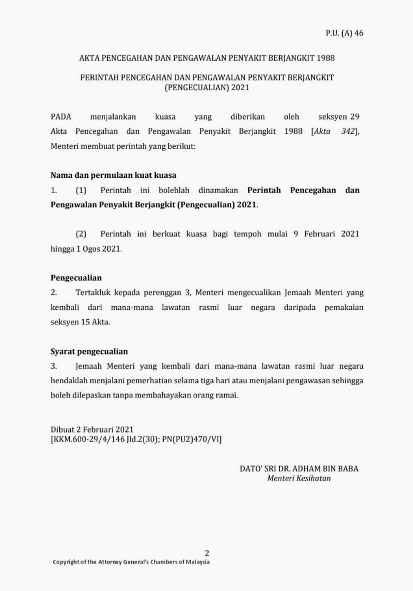 Perintah itu menyebut, Dr Adham mengecualikan jemaah menteri yang kembali dari mana-mana lawatan rasmi luar negara daripada pemakaian seksyen 15 Akta.