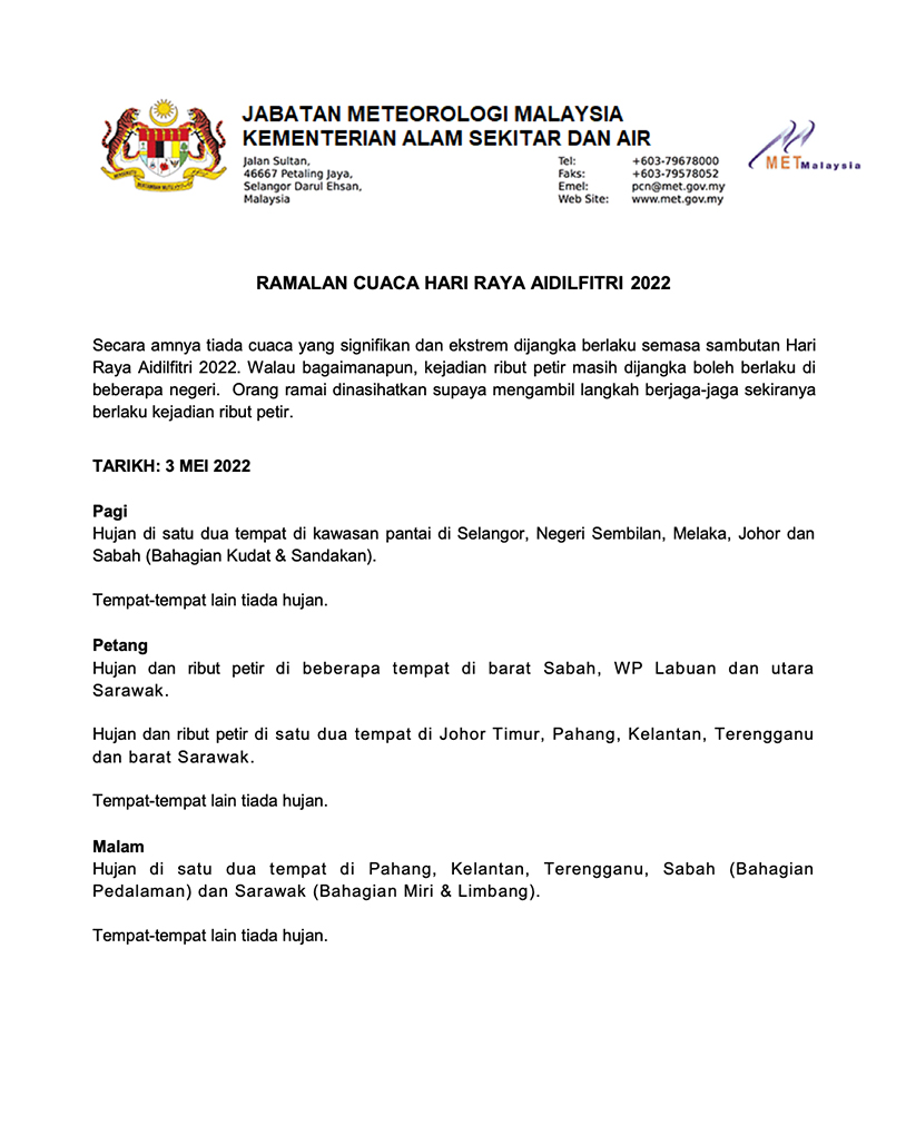 SHAH ALAM: Jabatan Meteorologi Malaysia (MET Malaysia) meramalkan tiada cuaca yang signifikan dan ekstrem dijangka berlaku semasa sambutan Hari Raya Aidilfitri kali ini.