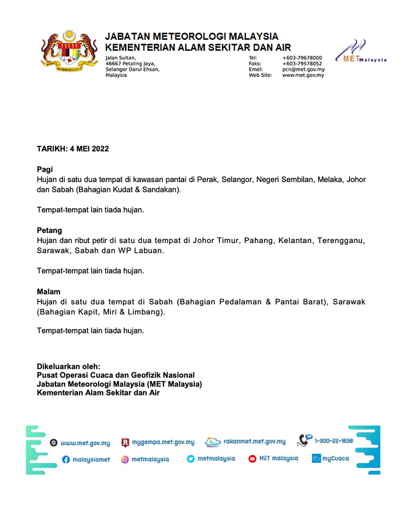 "Cuaca di kedua-dua hari tersebut biasa sahaja dengan kemungkinan ada hujan yang sedikit dan mungkin mendung pada waktu pagi di sebelah pantai Barat.