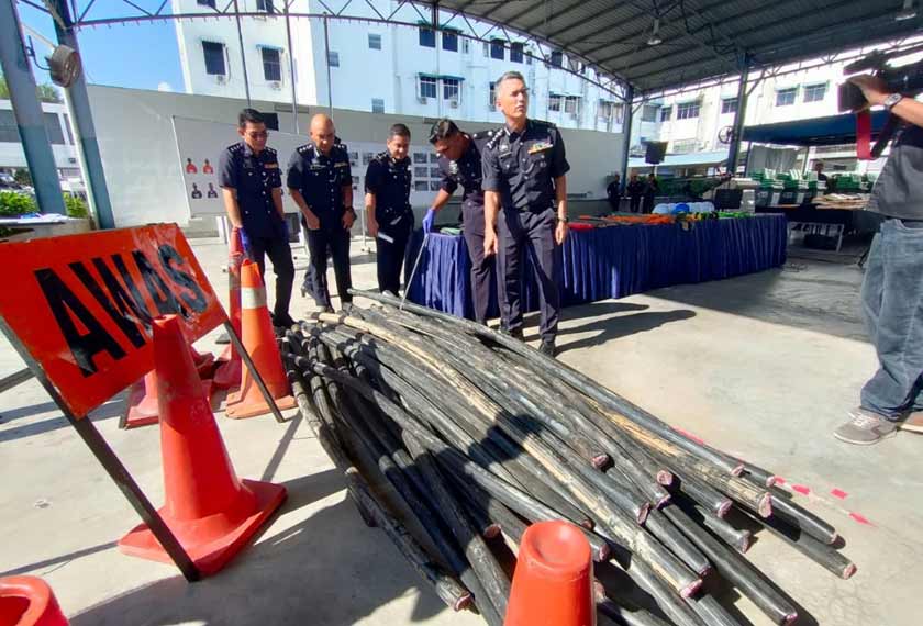 Dalam serbuan itu, polis turut merampas empat buah kenderaan, 65 batang kabel curi, kon jalan raya, baju keselamatan, pemotong besi, gergaji, tukul besi dan lain-lain.