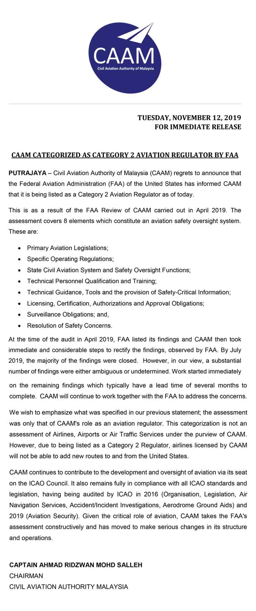 SELEPAS 24 jam Pentadbiran Penerbangan Udara (Federal Aviation Administration – FAA Amerika) melucutkan pengiktirafan kawal-selia penerbangan awam negara, Pihak Berkuasa Penerbangan Awam Malaysia (Civil Aviation Authority of Malaysia – CAAM) muncul dalam sidang media memberi maklum balas.