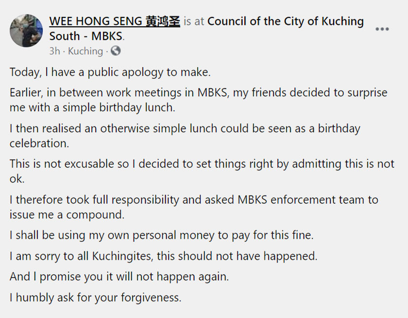 KUALA LUMPUR: Datuk Bandar Majlis Bandaraya Kuching Selatan (MBKS), Datuk Wee Hong Seng hari ini memohon maaf kerana melanggar prosedur operasi standard (SOP) COVID-19 dan bersedia dikompaun atas kesalahannya.