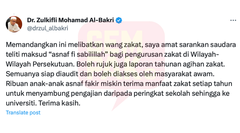 “Memandangkan ini melibatkan wang zakat, saya amat sarankan saudara teliti maksud ‘asnaf fi sabilillah’ bagi pengurusan zakat di Wilayah-Wilayah Persekutuan.