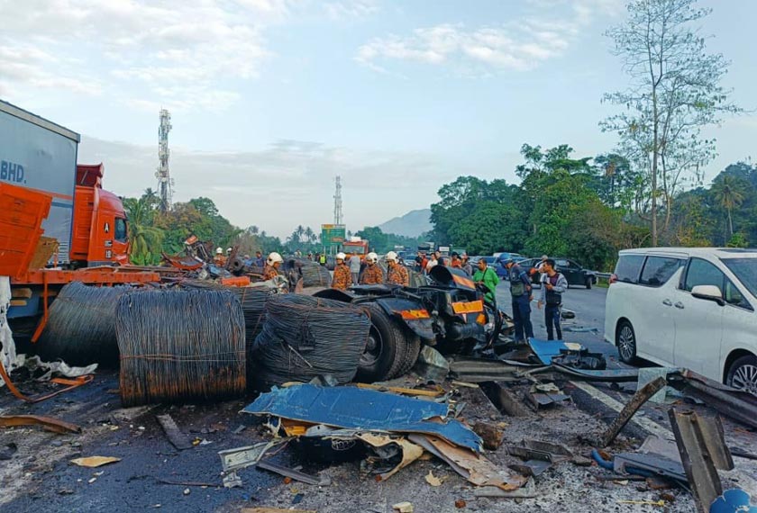 SIMPANG PULAI: Dua maut dalam kemalangan membabitkan tiga lori dan empat kereta di Kilometer 288.1 Lebuhraya Utara Selatan, arah utara dekat Kampung Tersusun Tekah, di sini, hari ini.