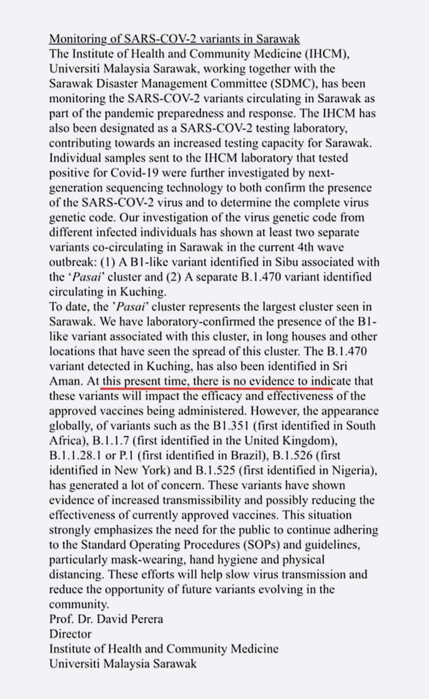 Pengarah Institut Kesihatan dan Perubatan Komuniti (IHCM), Universiti Malaysia Sarawak, Profesor Dr David Perera berkata, setakat ini tiada bukti makmal yang menunjukkan varian-varian tersebut akan menjejaskan keberkesanan vaksin yang kini disuntik kepada seluruh rakyat Malaysia.