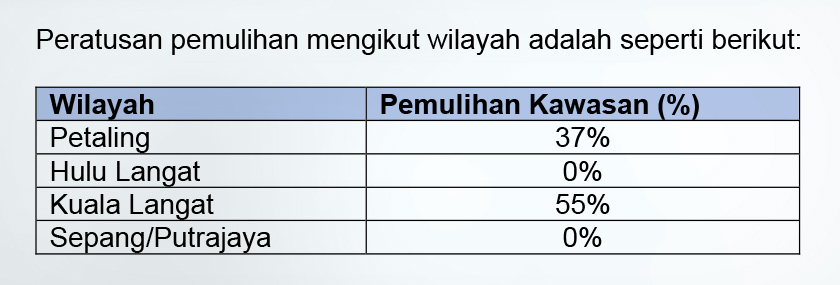 Sementara itu, sebanyak 228 kawasan masih lagi dalam proses pemulihan di wilayah yang terjejas iaitu Petaling, Hulu Langat, Kuala Langat, Sepang dan Putrajaya.
