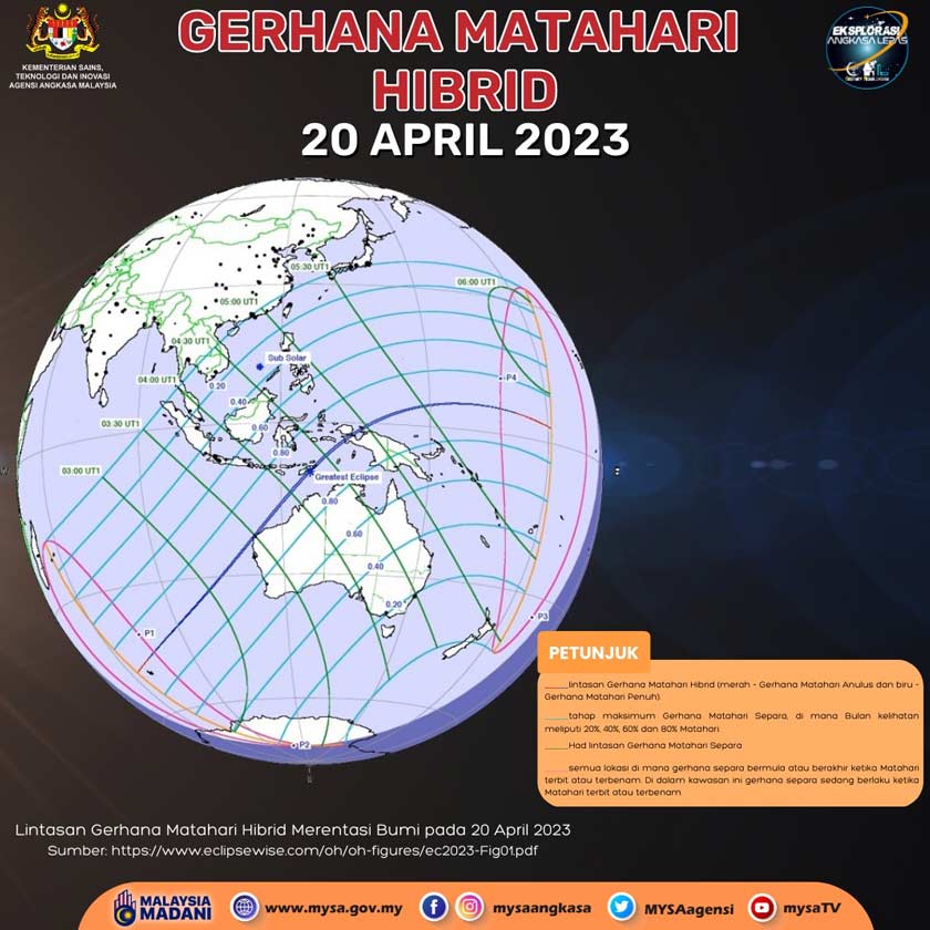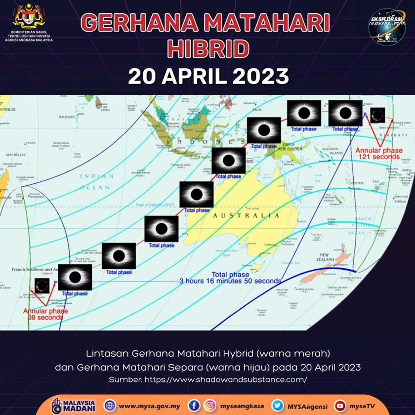5. Fenomena gerhana matahari hibrid pada 20 April 2023 berlaku di hemisfera selatan mulai jam 9:35 pagi dan berakhir pada 3 petang waktu tempatan.