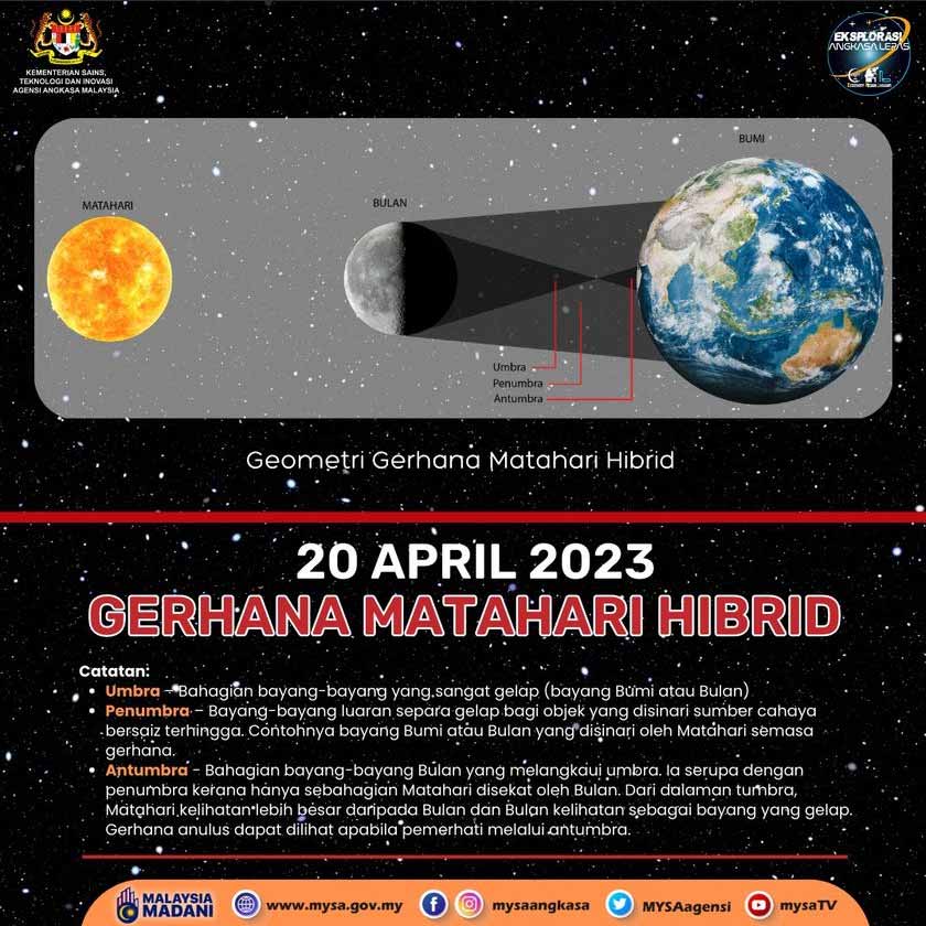 1. Gerhana Matahari yang berlaku pada 20 April 2023 dikenali sebagai gerhana matahari hibrid.