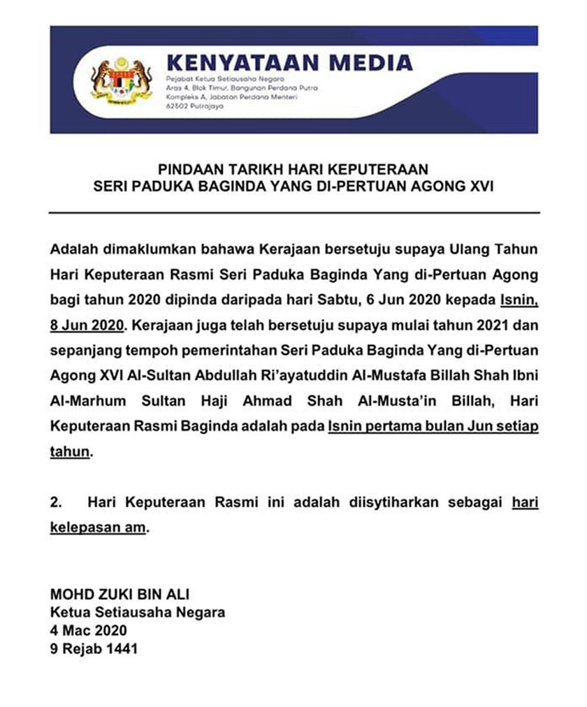 Ketua Setiausaha Negara, Datuk Seri Mohd Zuki Ali menerusi satu kenyataan pada Rabu berkata, kerajaan juga bersetuju bermula 2021 dan sepanjang tempoh pemerintahan Yang di-Pertuan Agong, Hari Keputeraan Rasmi baginda ialah pada Isnin pertama bulan Jun setiap tahun.