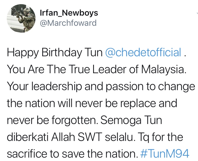 "Happy birthday Tun @chedetofficial. You are the true leader of Malaysia. Your leadership and passion to change the nation will never be replace and never be forgotten. Semoga Tun diberkati Allah swt selalu. Thank you for the sacrifice to save the nation. #TunM94," tulisnya.