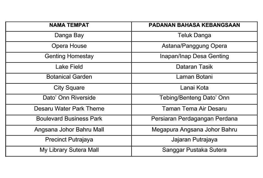 Adakah kita dipandang persis bangsa kayangan jika menggunakan Bukit Jalil Pavillion untuk memajukan ekonomi negara? Merudumkah nilai komersial produk tempatan jika nama tempat itu diubah menjadi Astaka Bukit Jalil? Tidak adakah pelancong yang akan datang ke Pendang Lake Resort jika namanya diberikan nafas tempatan menjadi Peranginan Danau Pendang? Kolotkah jika Bangsar Village bercitra tempatan dengan nama Desa Bangsar?