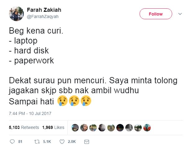 SEORANG gadis meluahkan rasa kecewa di laman sosial Twitter selepas beg kepunyaannya dicuri ketika sedang mengambil wuduk di sebuah surau.
