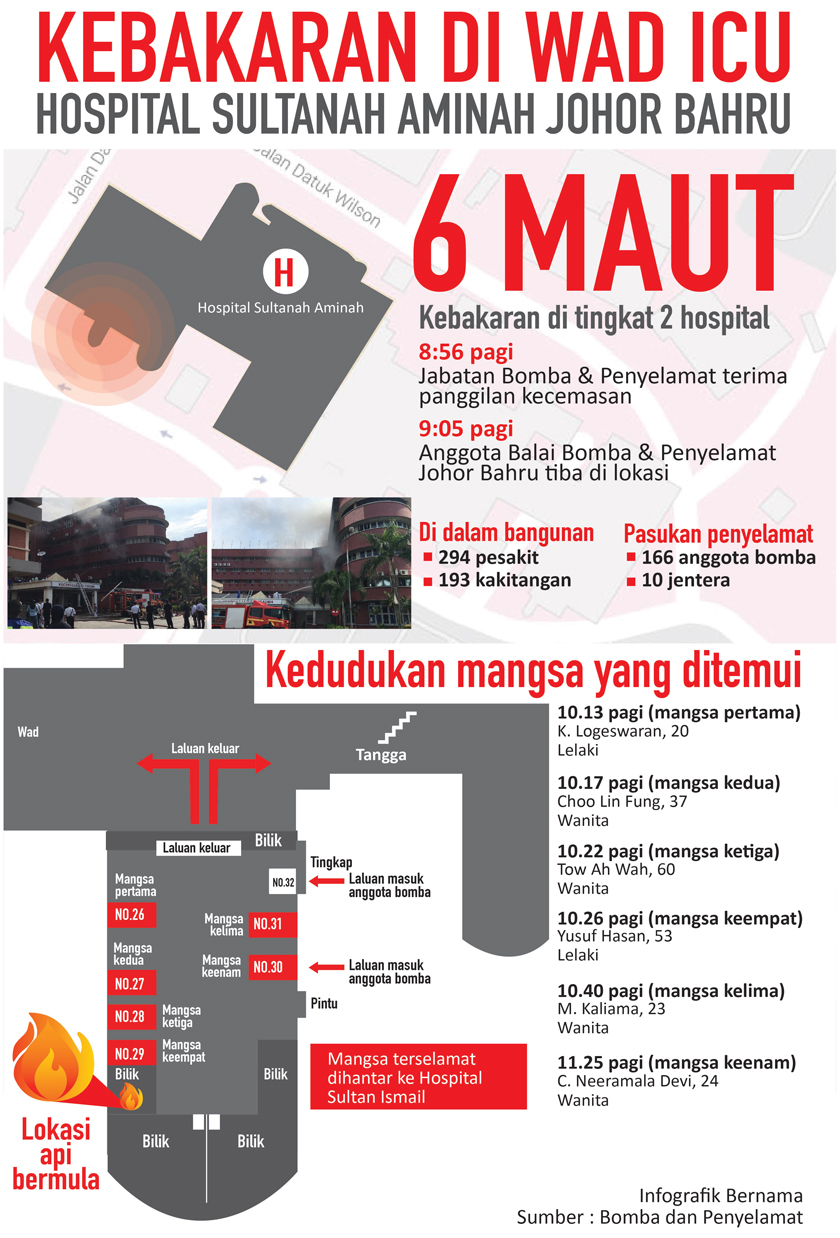 Enam pesakit terdiri dari empat wanita dan dua lelaki maut manakala seorang lagi terselamat dalam kebakaran di tingkat dua unit rawatan rapi (ICU) selatan Hospital Sultanah Aminah (HSA) pagi tadi.
