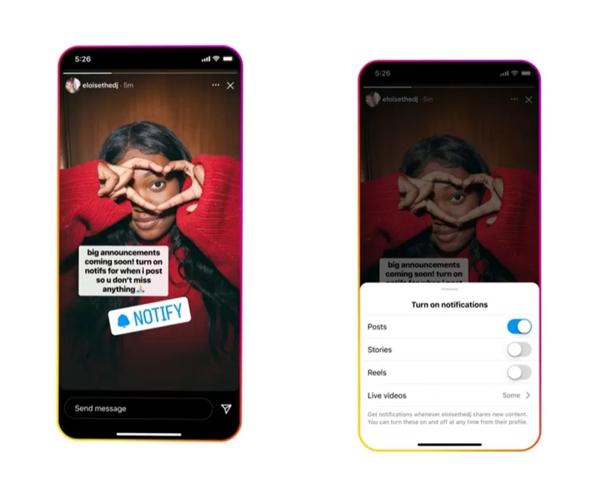 Ia berfungsi lebih kurang seperti Subscribe Sticker tadi yang kemudiannya menyediakan tiga pilihan notifikasi kemas kini yang termasuk Posts, Stories dan Reels.