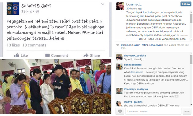 Kritikan pengguna laman Facebook terhadap cara pemakaian Nazri yang dikatakan tidak sesuai dalam majlis formal. -Sumber gambar Instagram bossned_