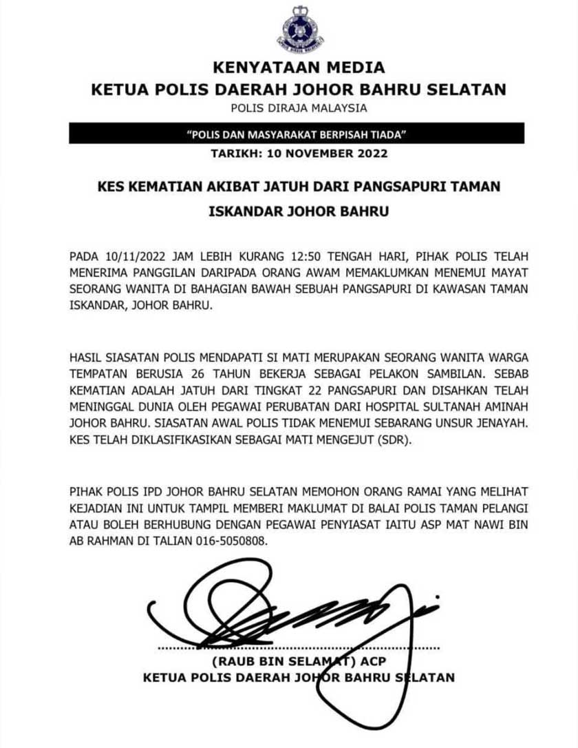 "Sebab kematian adalah akibat jatuh dari tingkat 22 pangsapuri dan telah disahkan meninggal dunia oleh Pegawai Perubatan dari Hospital Sultanah Aminah, Johor Bahru," kata kenyataan itu yang ditandatangani Ketua Polis Daerah Johor Bahru Selatan, ACP Raub Selamat.