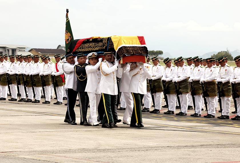 KUCHING: Jenazah bekas Yang Dipertua Negeri Sarawak Allahyarham Tun Abdul Taib Mahmud yang meninggal dunia awal pagi tadi, selamat tiba di Lapangan Terbang Antarabangsa Kuching pada jam 4.25 petang.