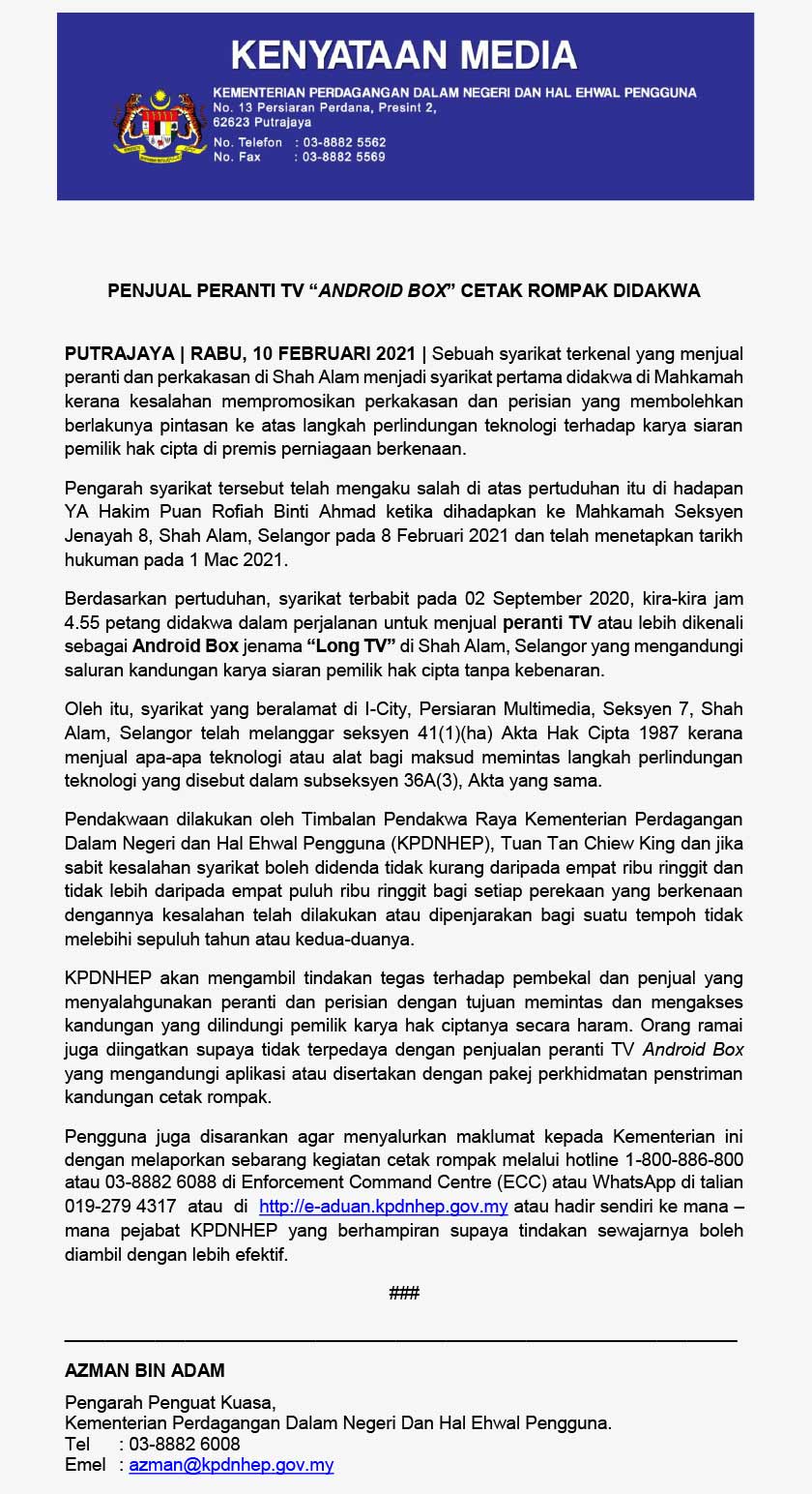 Dalam perkembangan yang sama, Pengarah Penguatkuasa Kementerian Perdagangan Dalam Negeri dan Hal Ehwal Pengguna (KPDNHEP), Azman Adam menerusi satu kenyataan berkata, pihaknya akan mengambil tindakan tegas terhadap pembekal dan penjual yang menyalahgunakan peranti kotak Android bagi tujuan memintas atau mengakses kandungan yang dilindungi karya hak ciptanya secara haram.