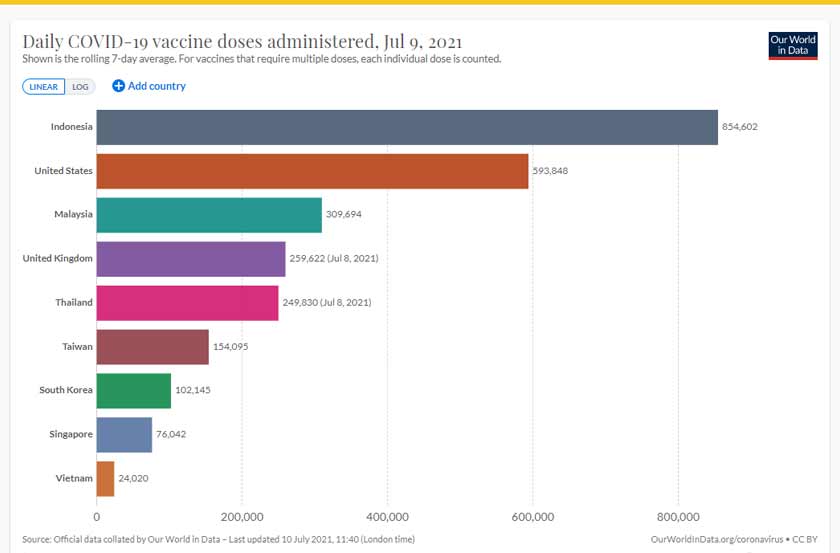 Berdasarkan data berkenaan, setakat 9 Julai 2021, Singapura di tangga pertama dengan purata harian vaksinasi 1.3 bagi setiap 100 orang, diikuti Malaysia merekodkan 0.96 bagi setiap 100 orang, Taiwan; 0.65, United Kingdom ; 0.38, Thailand; 0.36, Indonesia 0.31, Korea Selatan; 0.2, Amerika Syarikat; 0.18 dan Vietnam; 0.02.