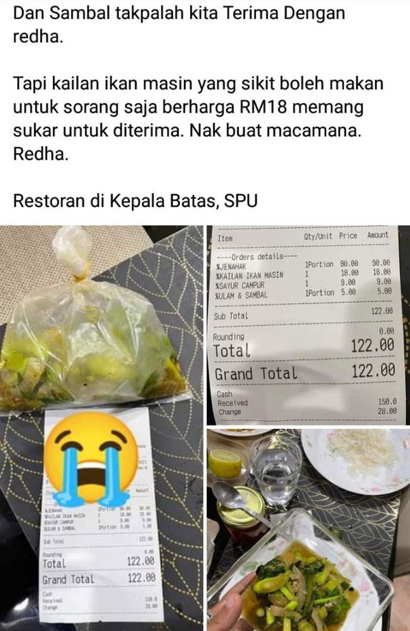 Pada Ahad, seorang pelanggan di Pulau Pinang mendakwa telah membeli sebungkus kailan ikan masin bagi seorang makan berharga RM18 di sebuah restoran di Kepala Batas.