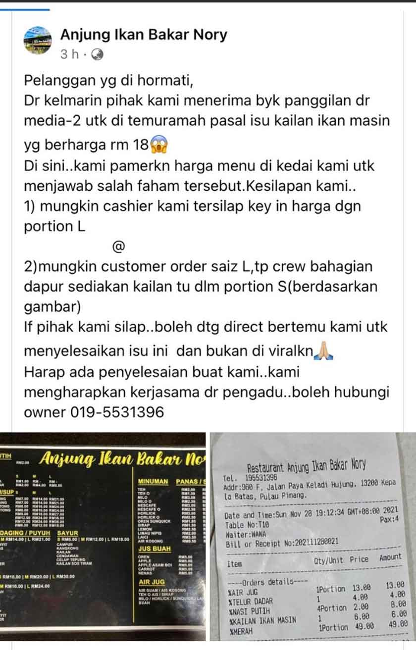 Pada Ahad, seorang pelanggan mendakwa telah membeli sebungkus kailan ikan masin bagi seorang makan pada berharga RM18 di sebuah restoran di Kepala Batas.