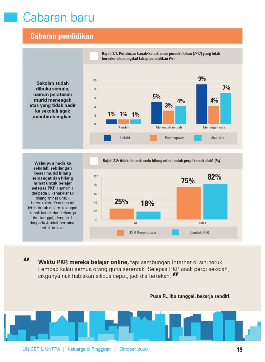Selain itu, ibu bapa berdepan cabaran untuk memastikan anak-anak mereka terus bersekolah, terutamanya bagi ketua isi rumah wanita.