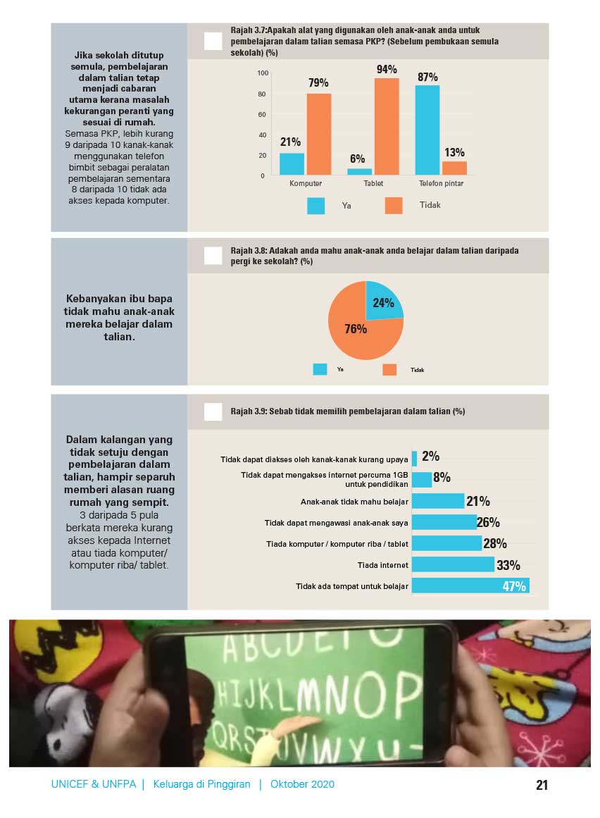 Semasa PKP, lebih kurang 9 daripada 10 kanak-kanak menggunakan telefon bimbit sebagai peralatan pembelajaran sementara 8 daripada 10 tidak ada akses kepada komputer.