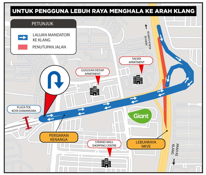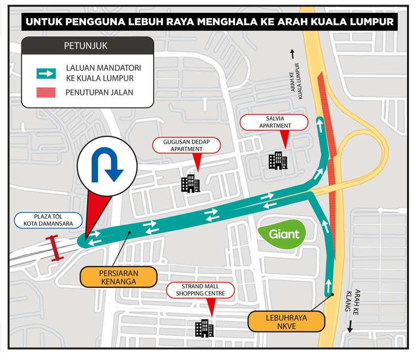 "Pengguna Lebuhraya NKVE dari arah Klang yang menghala ke Kuala Lumpur akan melalui susur persimpangan masuk ke Kota Damansara dan membuat pusingan 'U' di Plaza Tol Kota Damansara, menggunakan laluan yang dibuka sebelum melepasi plaza tol.