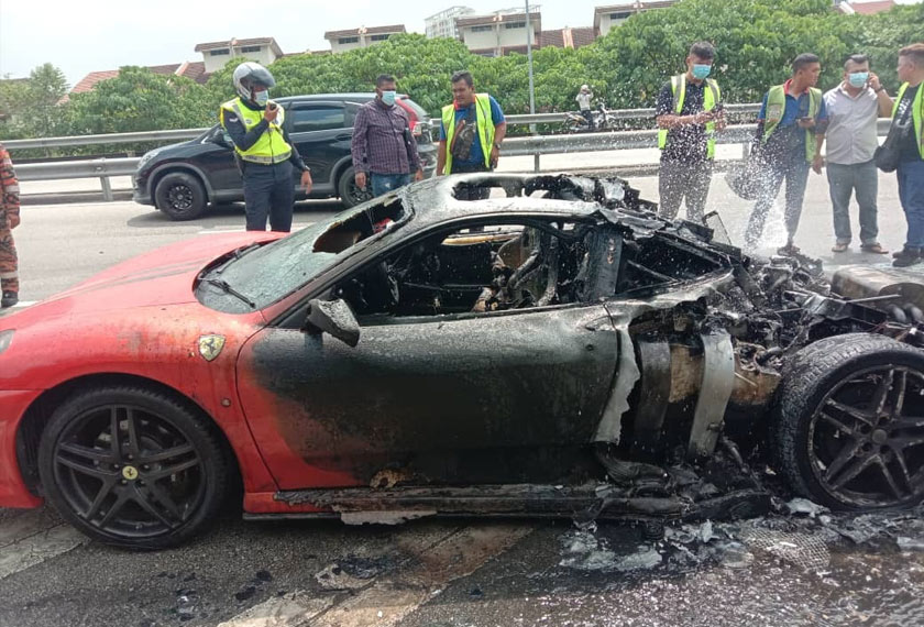 SEBERANG JAYA:Sebuah kereta mewah Ferrari model 430 terbakar dalam kejadian di susur keluar Permatang Pauh dekat Lebuhraya Butterworth-Kulim (BKE), Seberang Jaya, Pulau Pinang pada Rabu.