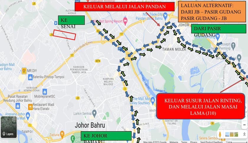 Onn Hafiz berkata bagi laluan dari Johor Bahru ke Pasir Gudang dan dari Pasir Gudang ke Johor Bahru pengguna dicadangkan keluar melalui Jalan Pandan (FT03) dan susur Jalan Rinting, dan melalui Jalan Masai Lama (J10).