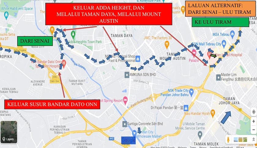 Bagi laluan dari Skudai ke Ulu Tiram pula, beliau mencadangkan supaya pengguna keluar susur Angsana Mall, melalui Jalan Tampoi dan keluar Kampung Ubi Baru.
