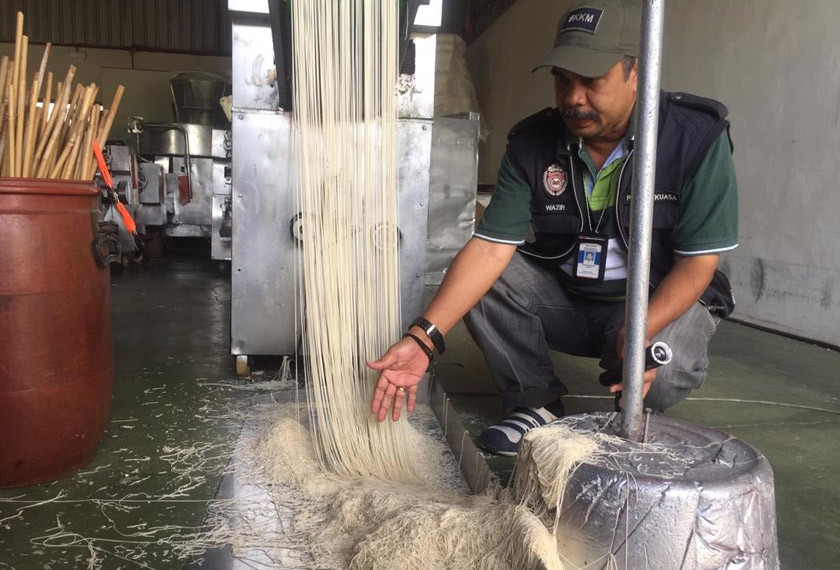 Sementara itu, pemeriksaan di kilang memproses mi pula mendapati produk yang siap diproses dibiarkan bersepah di lantai dan dihurung lalat.
